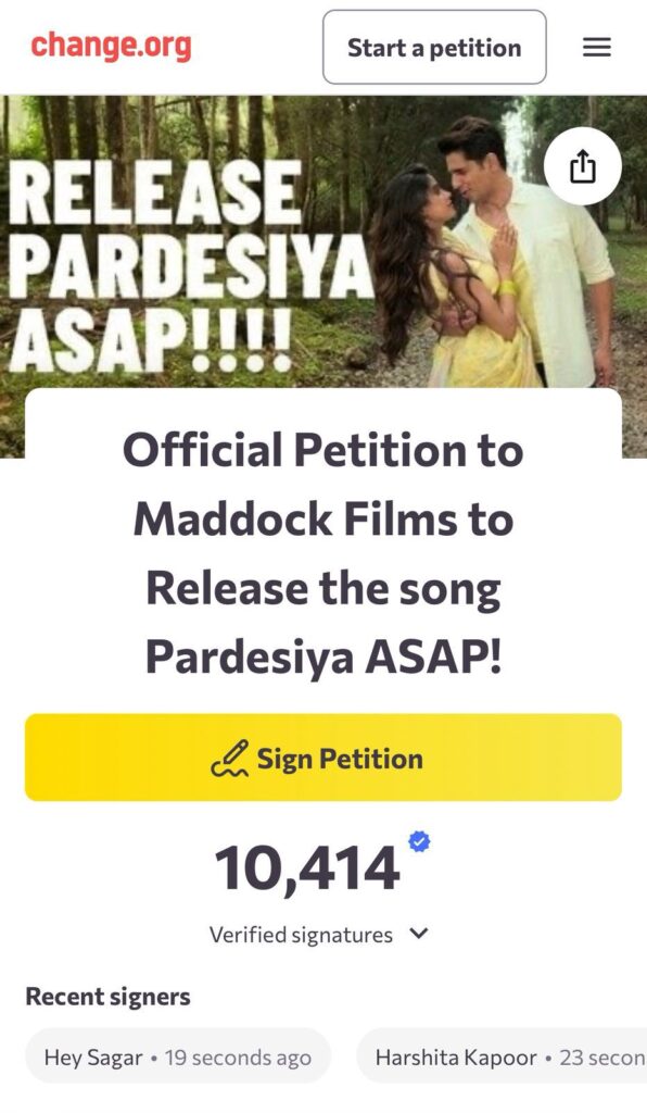 इतना ही नहीं फैंस ने मैडॉक फिल्म्स को ऑनलाइन पेटिशन भेज दी है! फैसला साफ है। इंटरनेट को परदेसिया चाहिए… और बहाने नहीं सुनने! तो जन-भावनाओं का आदर करते हुए, परम सुंदरी का ये जादुई आवाज़ में, सोनू निगम की दिल छू लेने वाली आवाज़ में जल्द ही रिलीज़ होने वाला है।